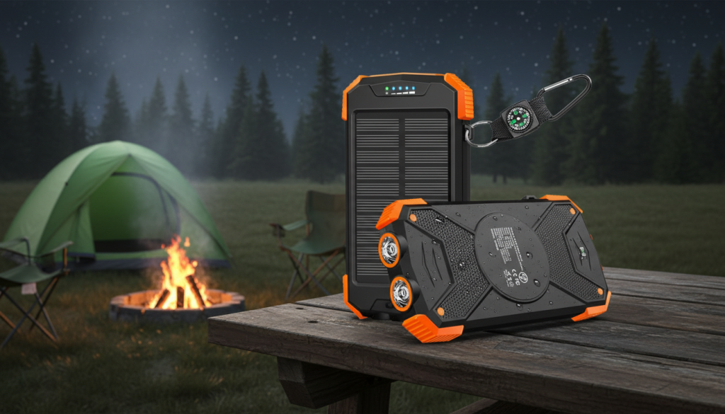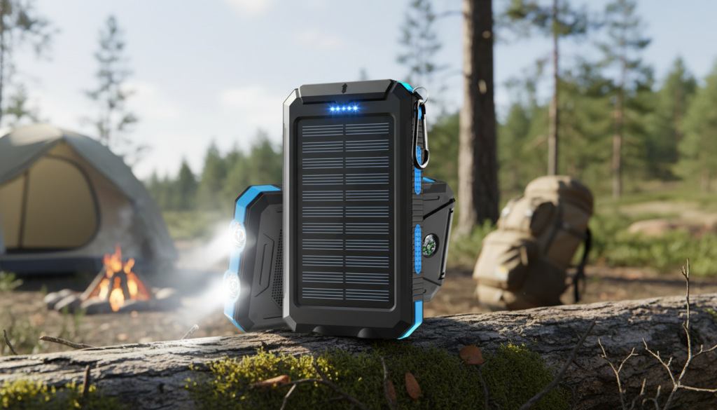 A rugged-style solar power bank with USB-C input/output and built-in flashlight. This is the “outdoor-ready” design many campers like.